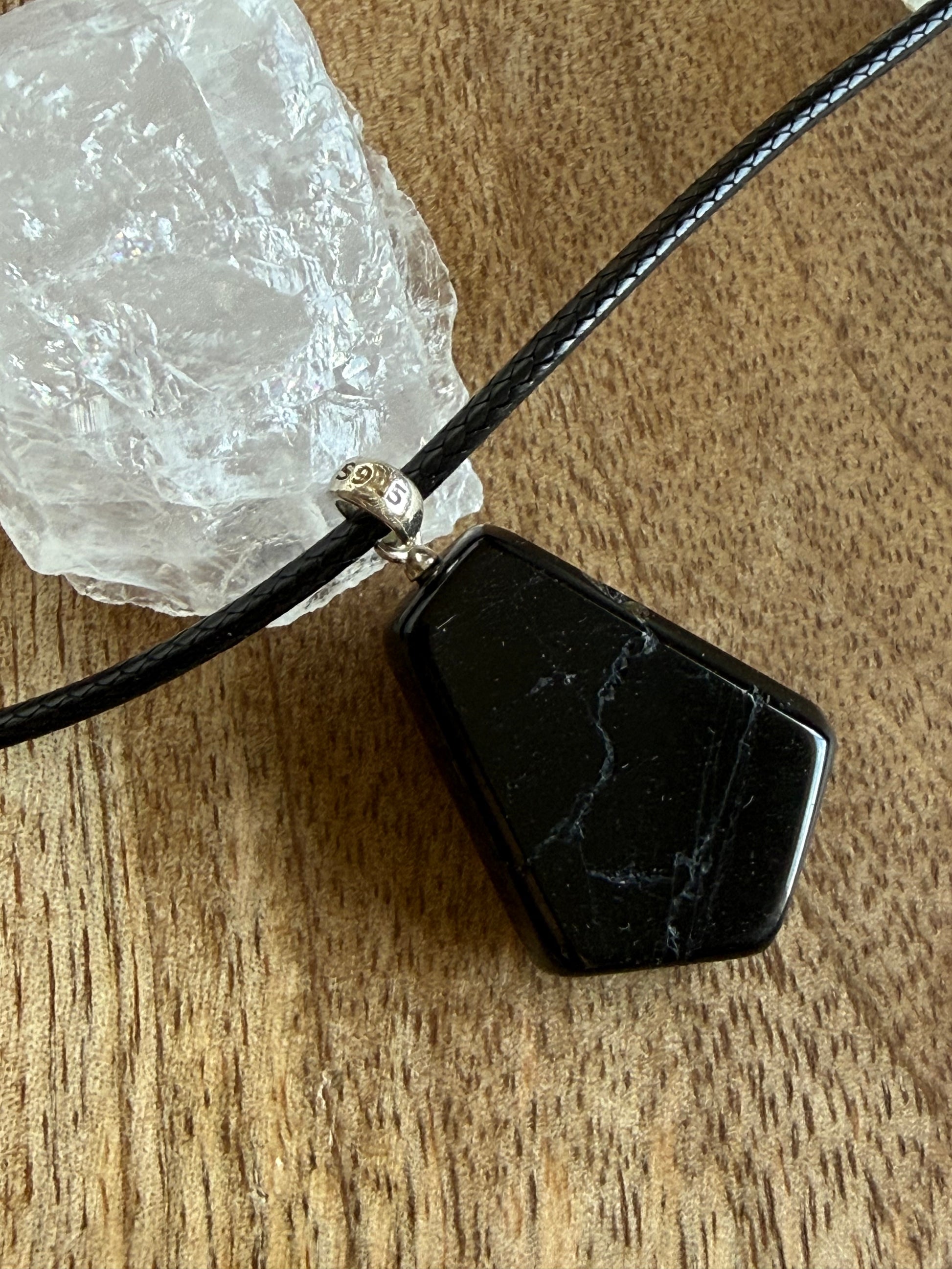 Collar ajustable hasta 30 inches, realizado en cordon encerado de color negro, Colgante de Turmalina Negra Natural no pulida, por lo cual la piedra tiene forma irregular, puede presentar pequeñas grietas como parte de su belleza natural, el colgante tiene un engarce de plata 925, y Terminaciones de balines de plata 925.