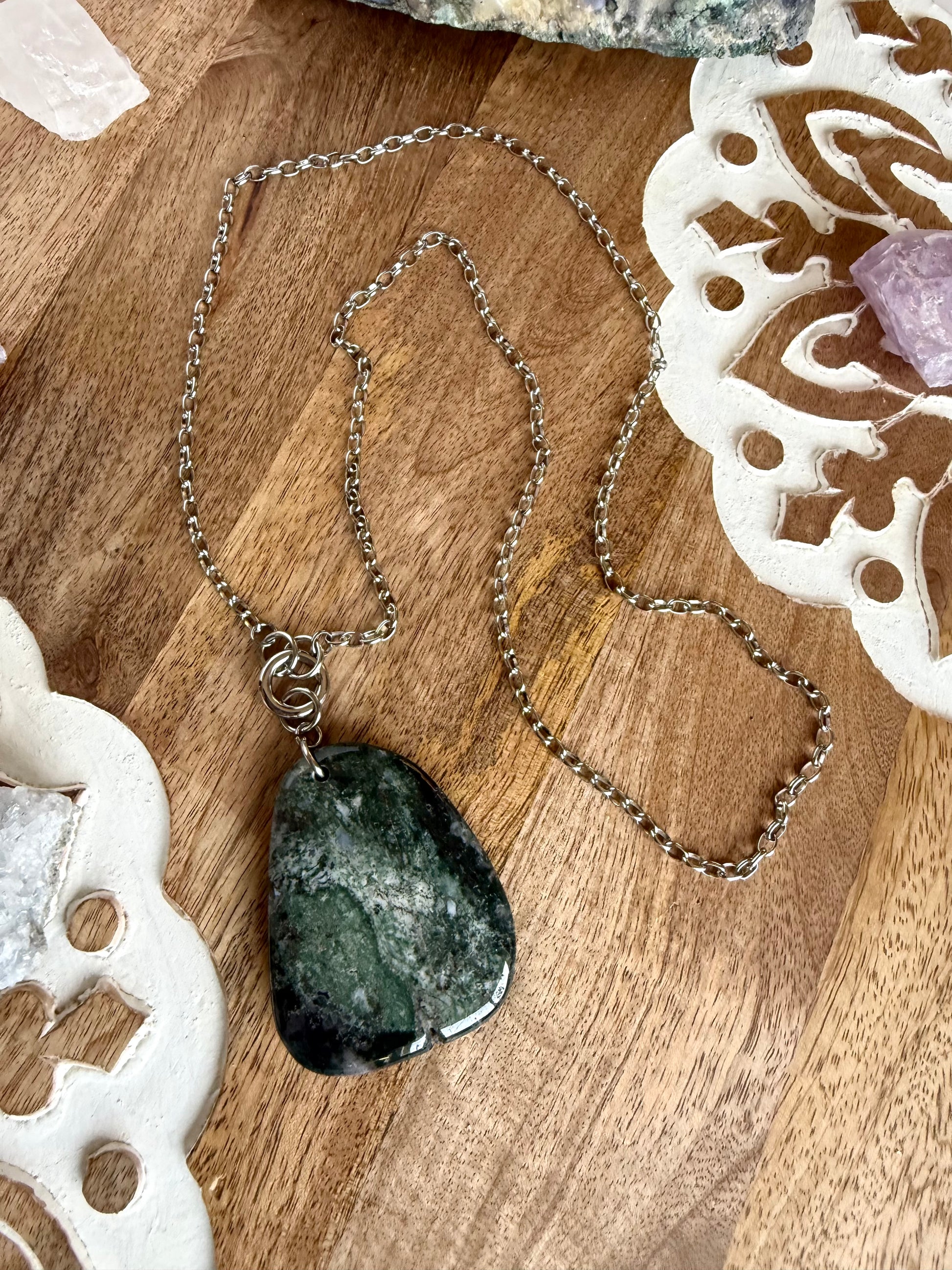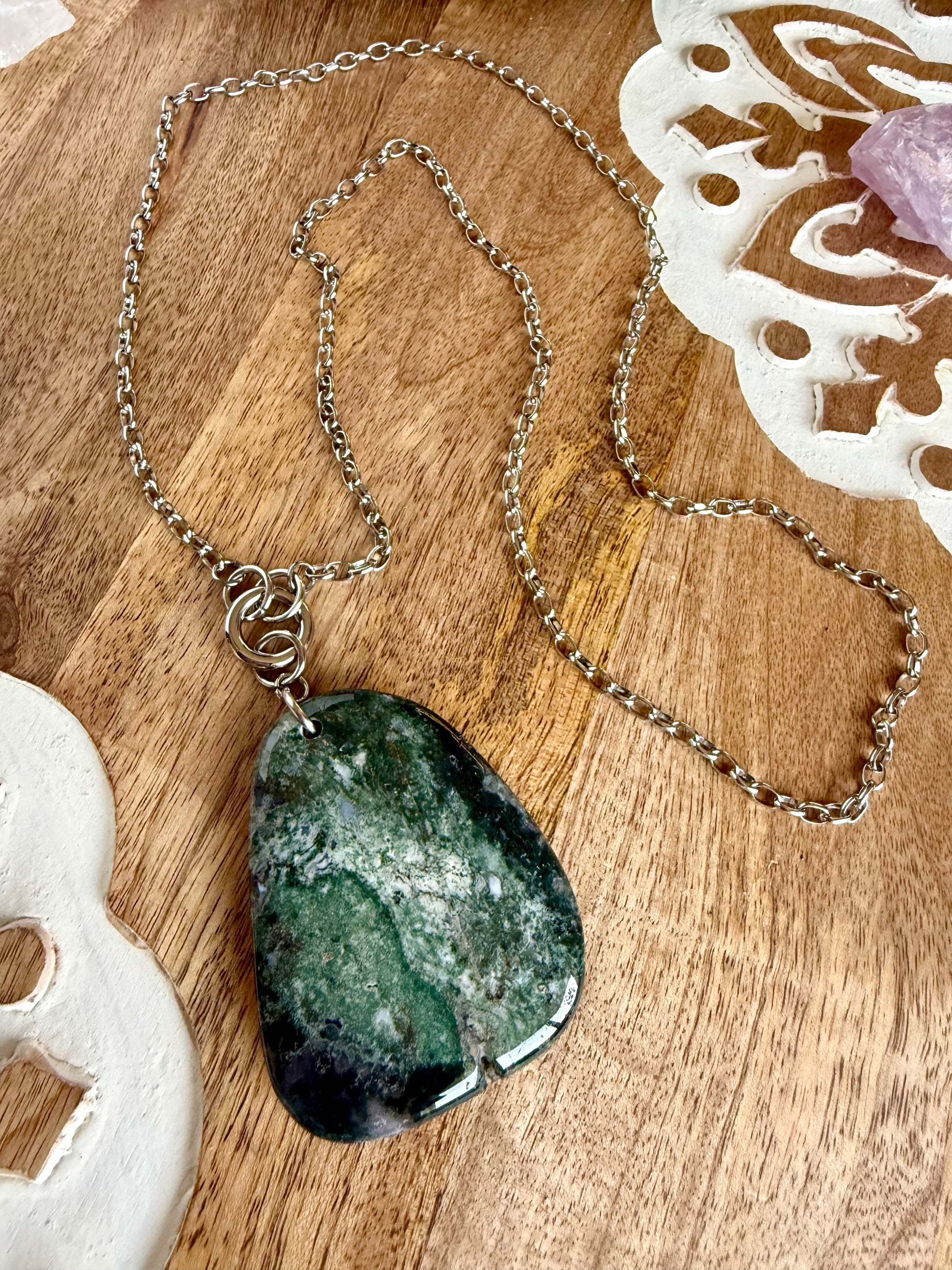 Cadena de Acero Inoxidable de 30-31 inches de largo , con colgante de piedra de Ágata Musgo de 40x60mm y gancho redondo tipo carabinero de acero inoxidable.