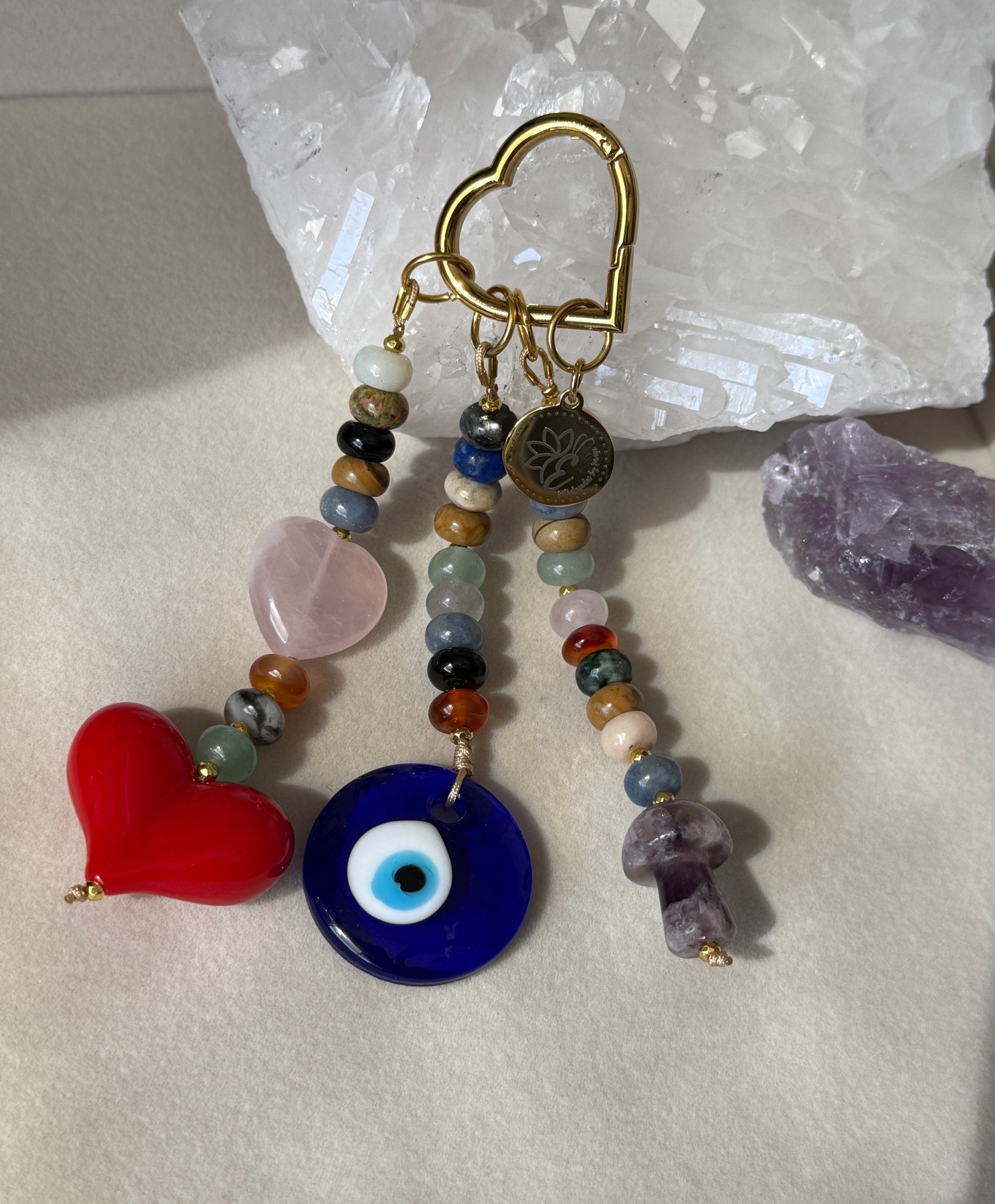 Charm para bolso elaborado con una mezcla de piedras rondelles, una cuenta de hongo de amatista, un ojo turco de vidrio, un corazón de cuarzo rosa y un corazón rojo hinchado de acrílico, con componentes de Acero Inoxidable.