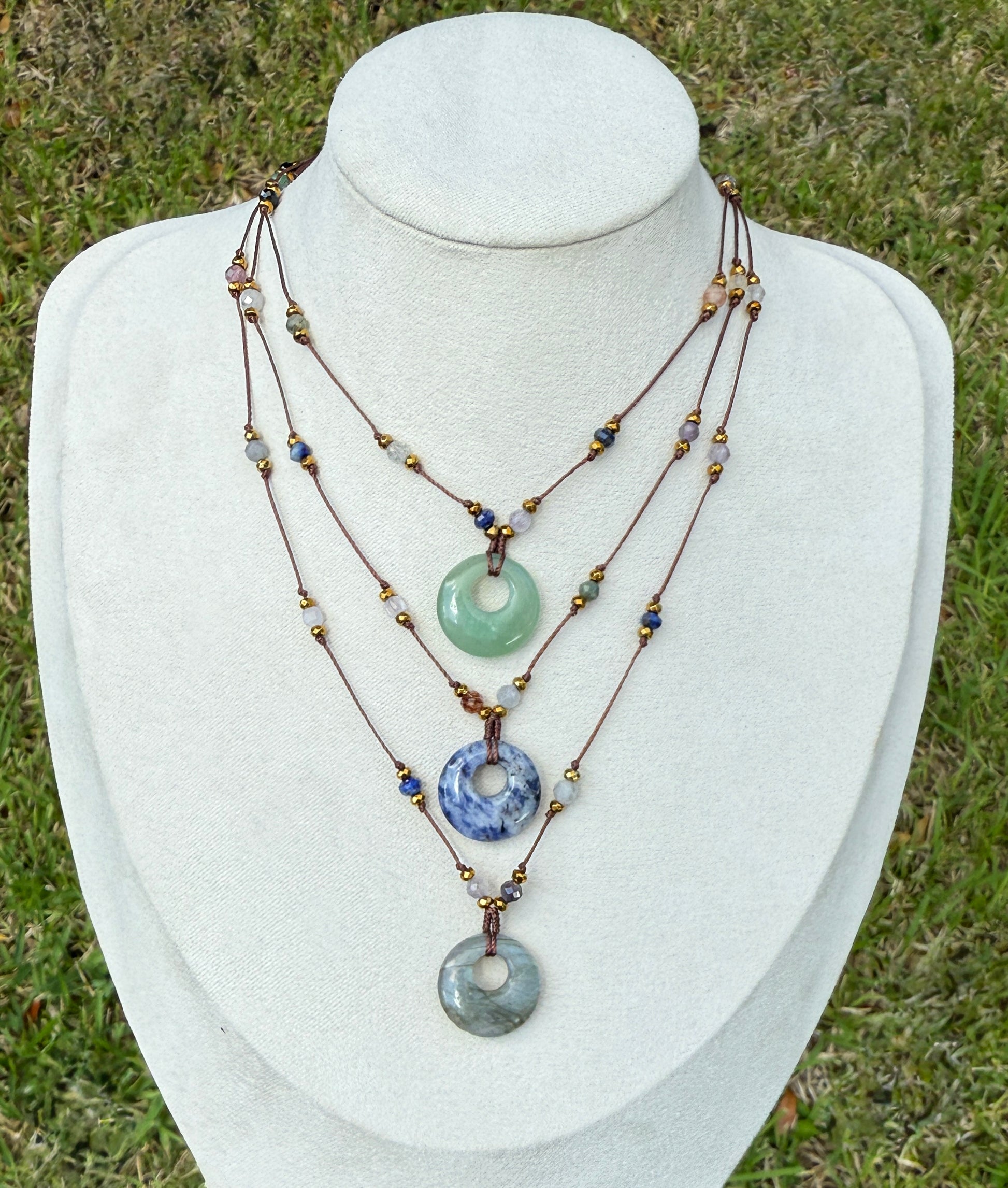 Choker necklaces handmade with nylon cord, with different crystals of 3 and 4 inches such as amethyst, black onyx, pink quartz, green aventurine, white quartz, tiger's eye, rutilated quartz, turquoise, amazonite and hematite separators, with a focal stone in the shape of a donut, to choose between Sodalite, Green Aventurine or Labradorite.