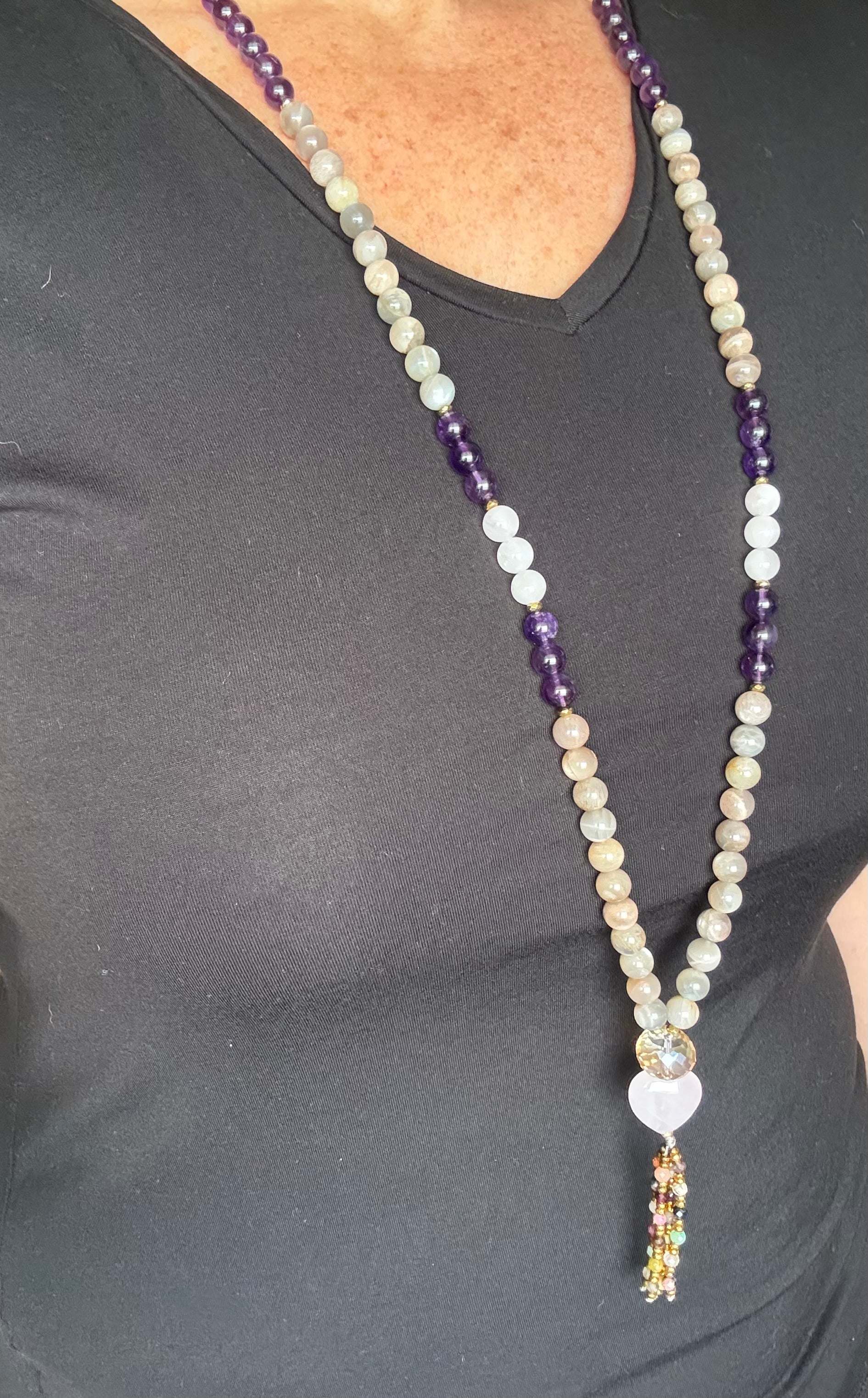 Esta hermosa Japa Mala combina las energías de Serenidad y Protección que nos regala la Amatista, las energías de Intuición y Calma de la Piedra Luna y el Amor y Compasión del Cuarzo Rosado.