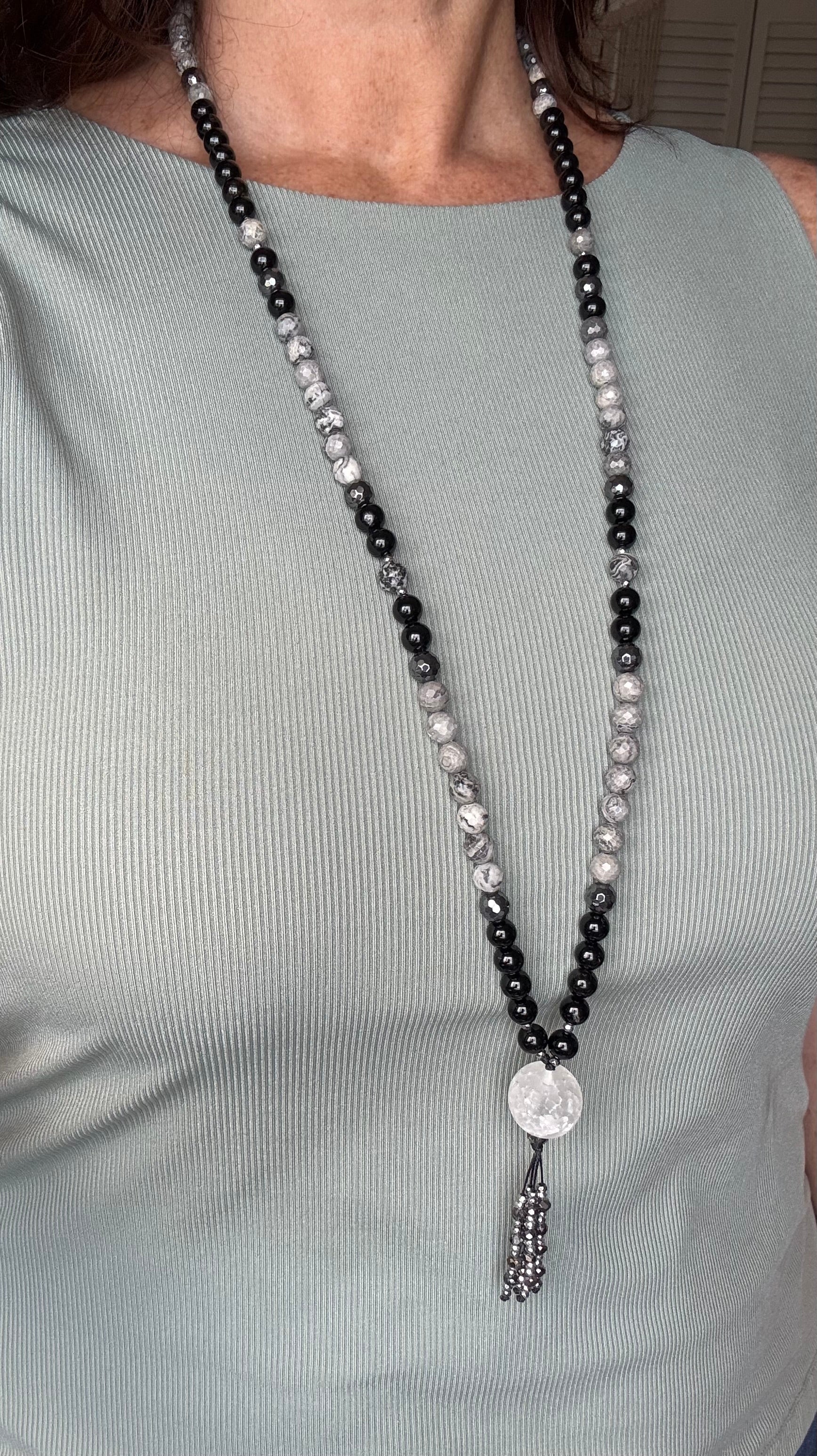 Hermosa Japa Mala compuesta por cuentas de 8mm de Turmalina negra, Ágata de encaje plateado y Hematite facetado, con focal de Cuarzo Lechozo craquelado como cuenta Gurú.