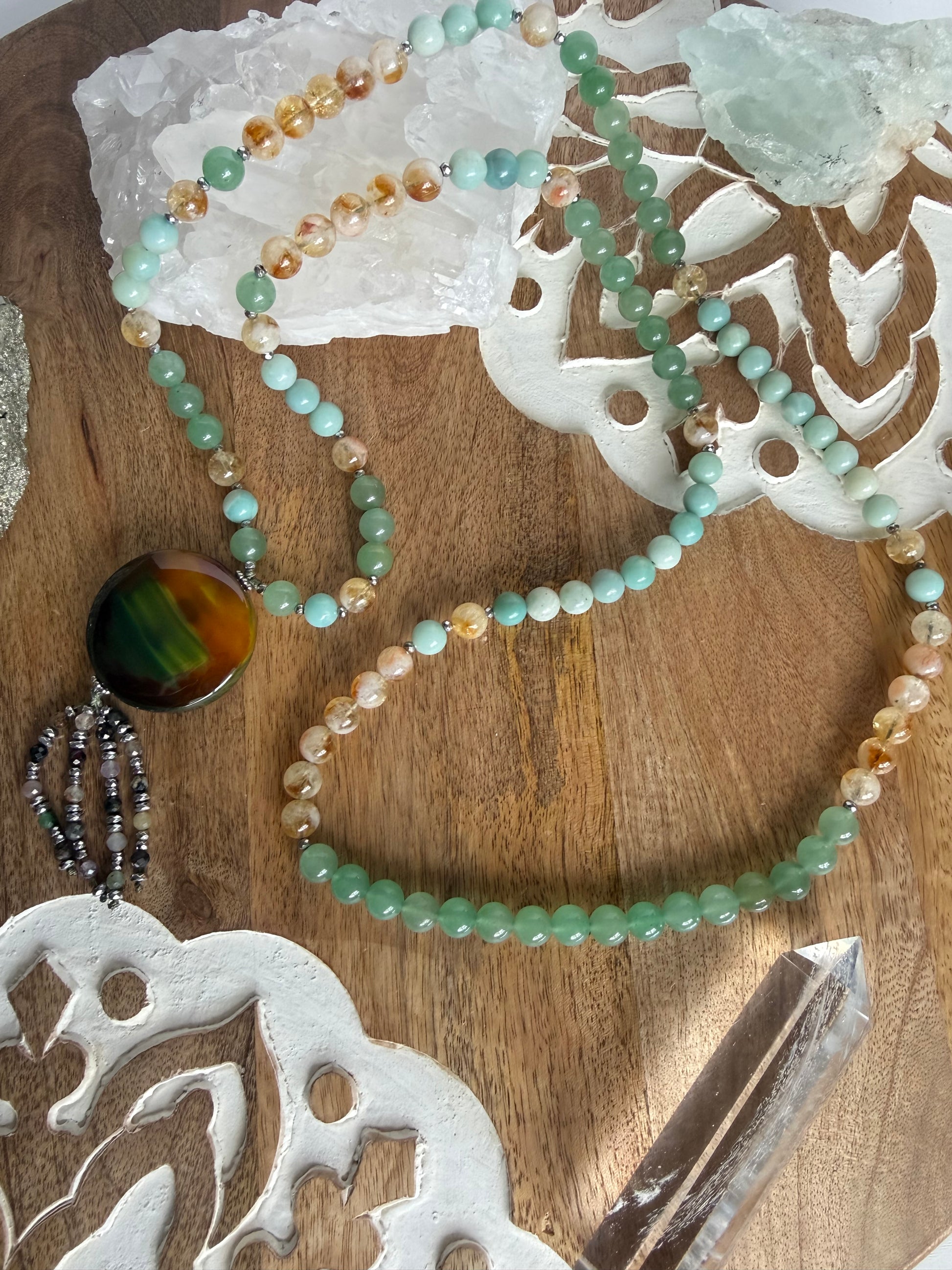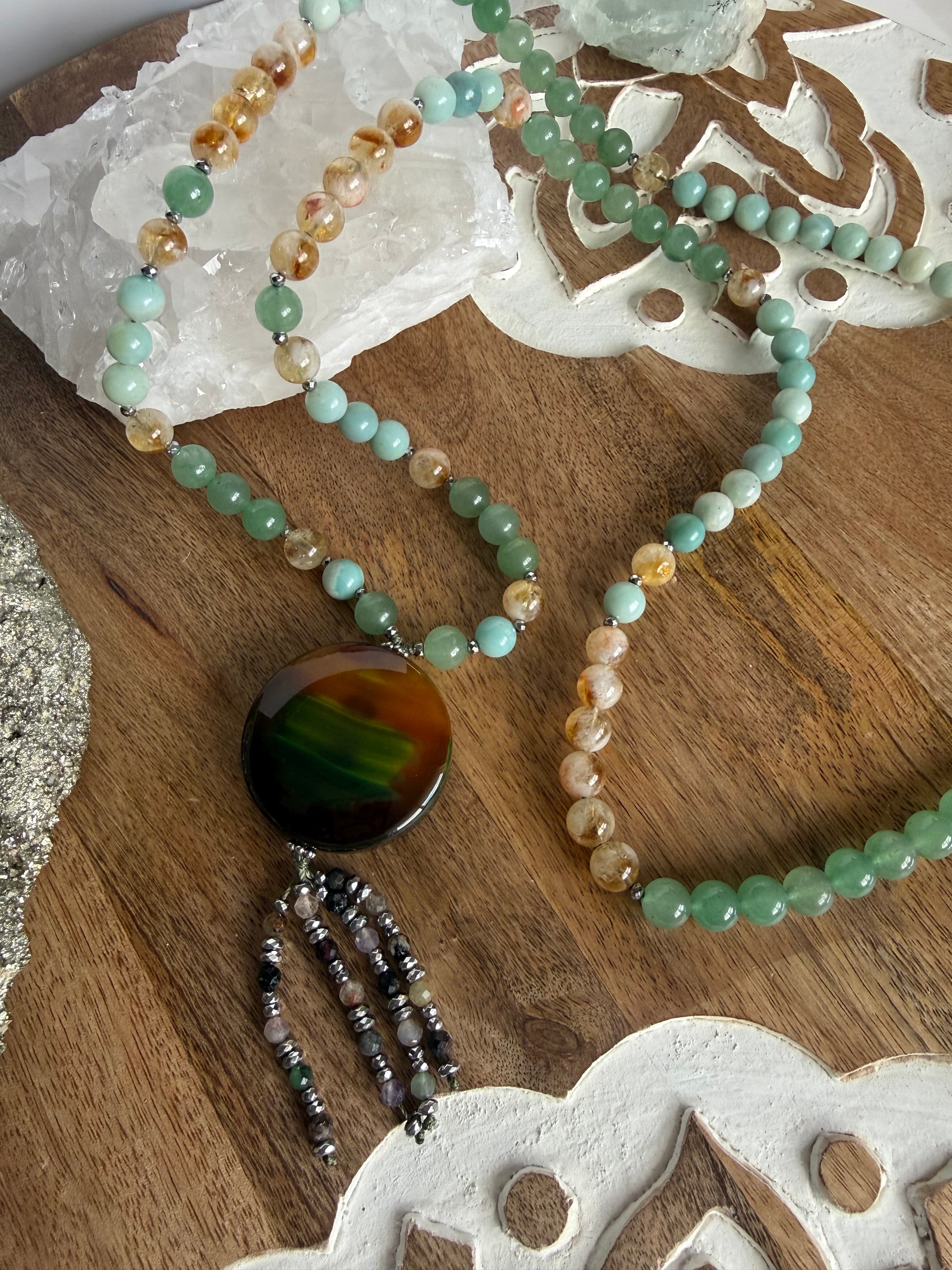 Japa Mala compuesta por Aventurina Verde, Amazonita y Citrino de 8mm y como focal y piedra Gurú una hermosa Ágata Natural.