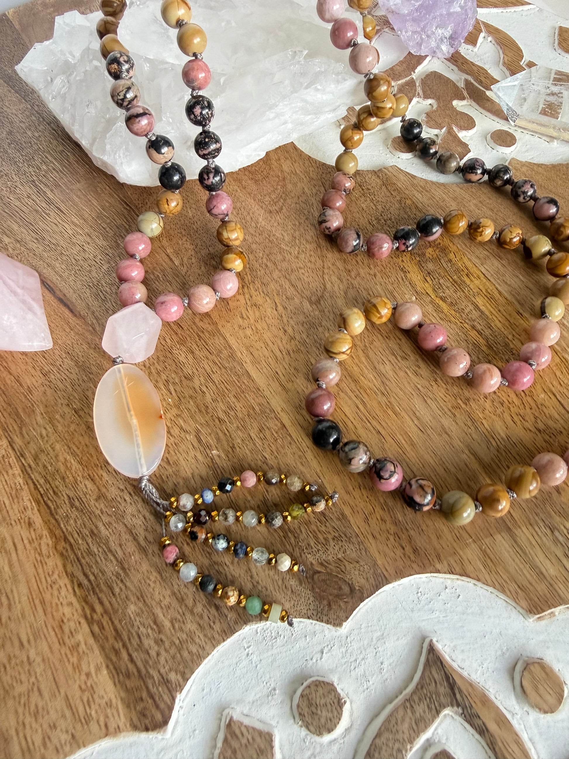 Esta Japa Mala anudada está compuesta por cuentas de 8mm de Jaspe Madera y Rodonita y como punto focal y piedra Gurú un cuarzo Rosa y una Àgata.