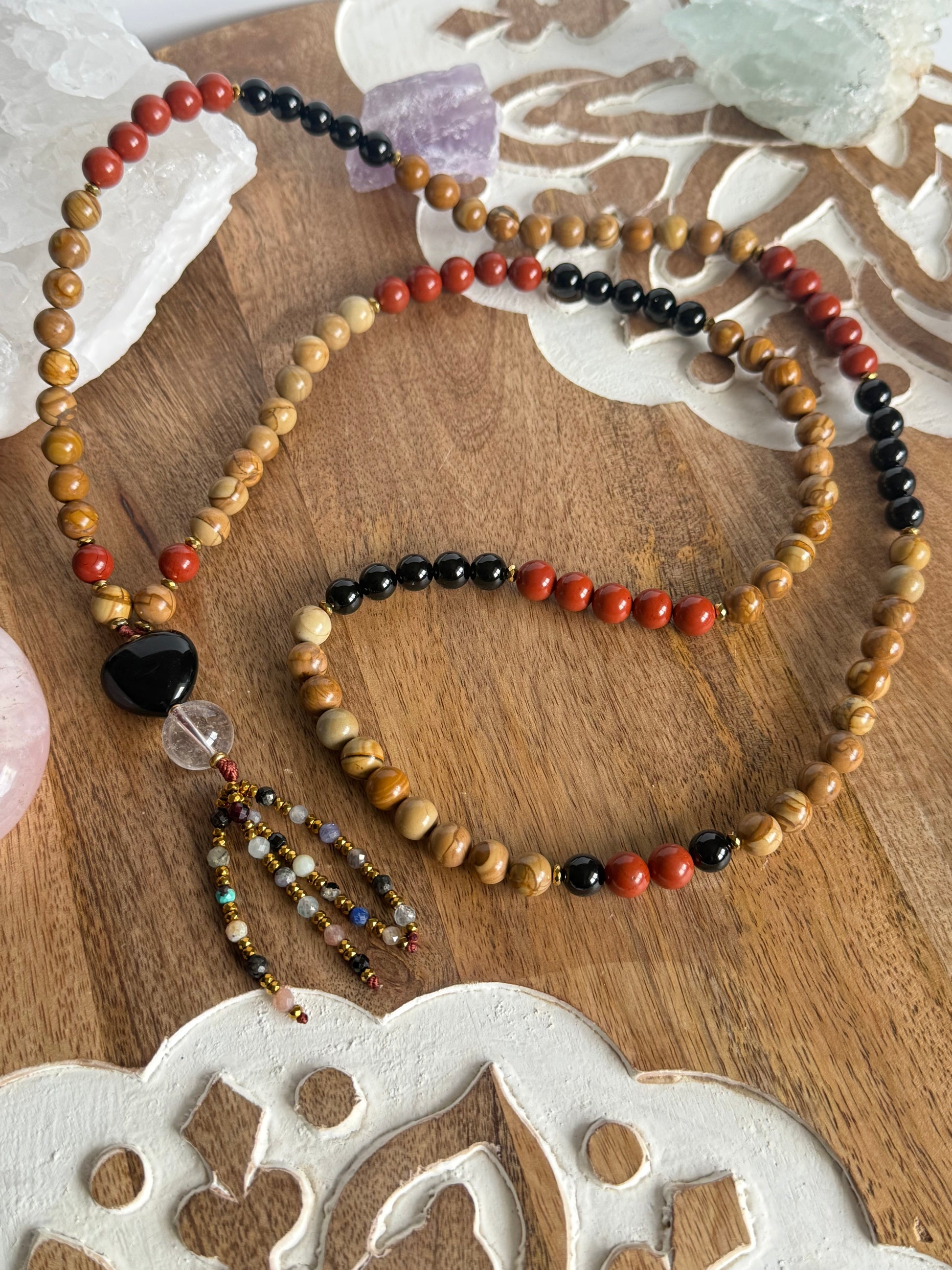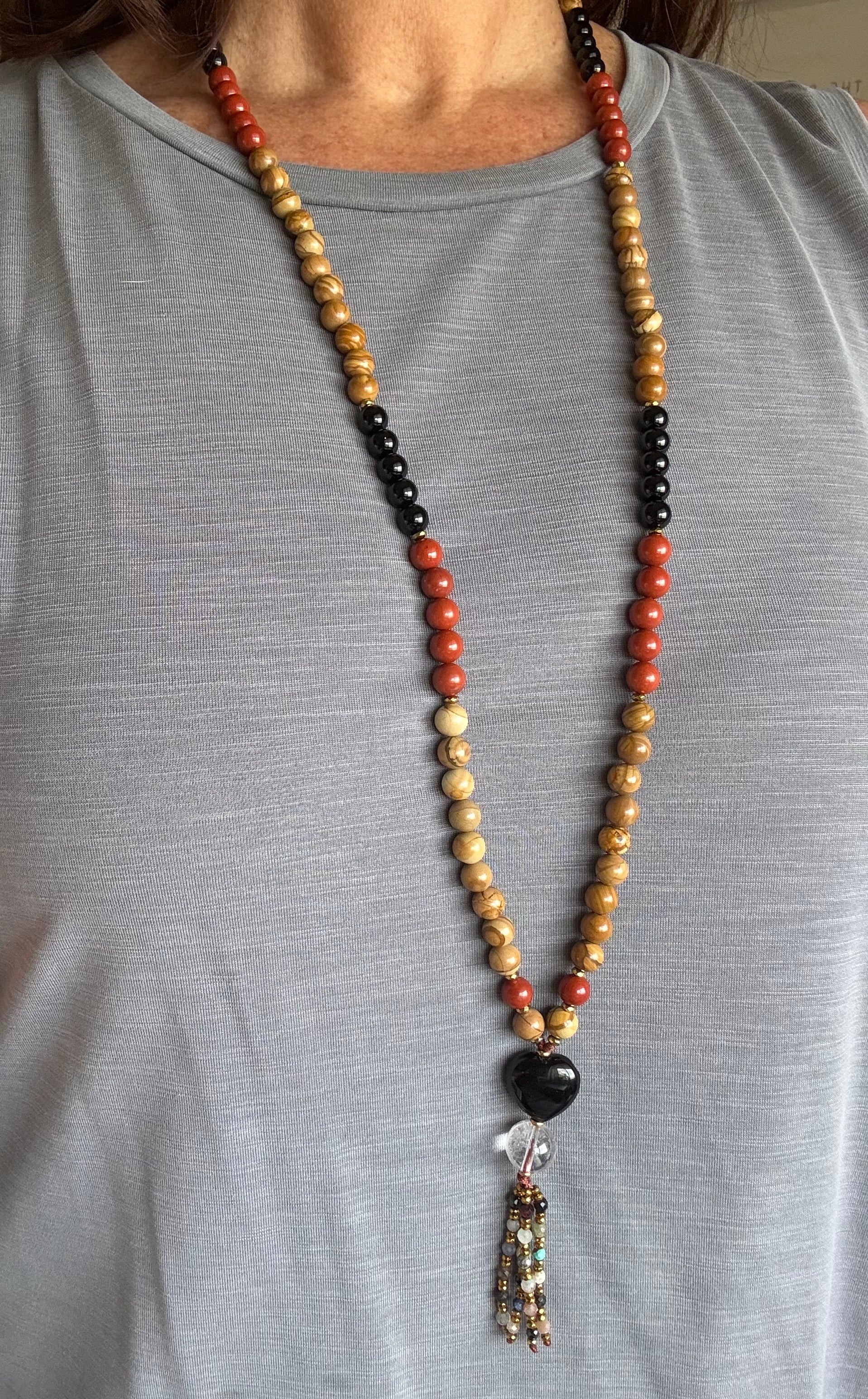 Esta hermosa Japa Mala combina las energías de Protección , Fuerza, Vitalidad y Conexión con la tierra.