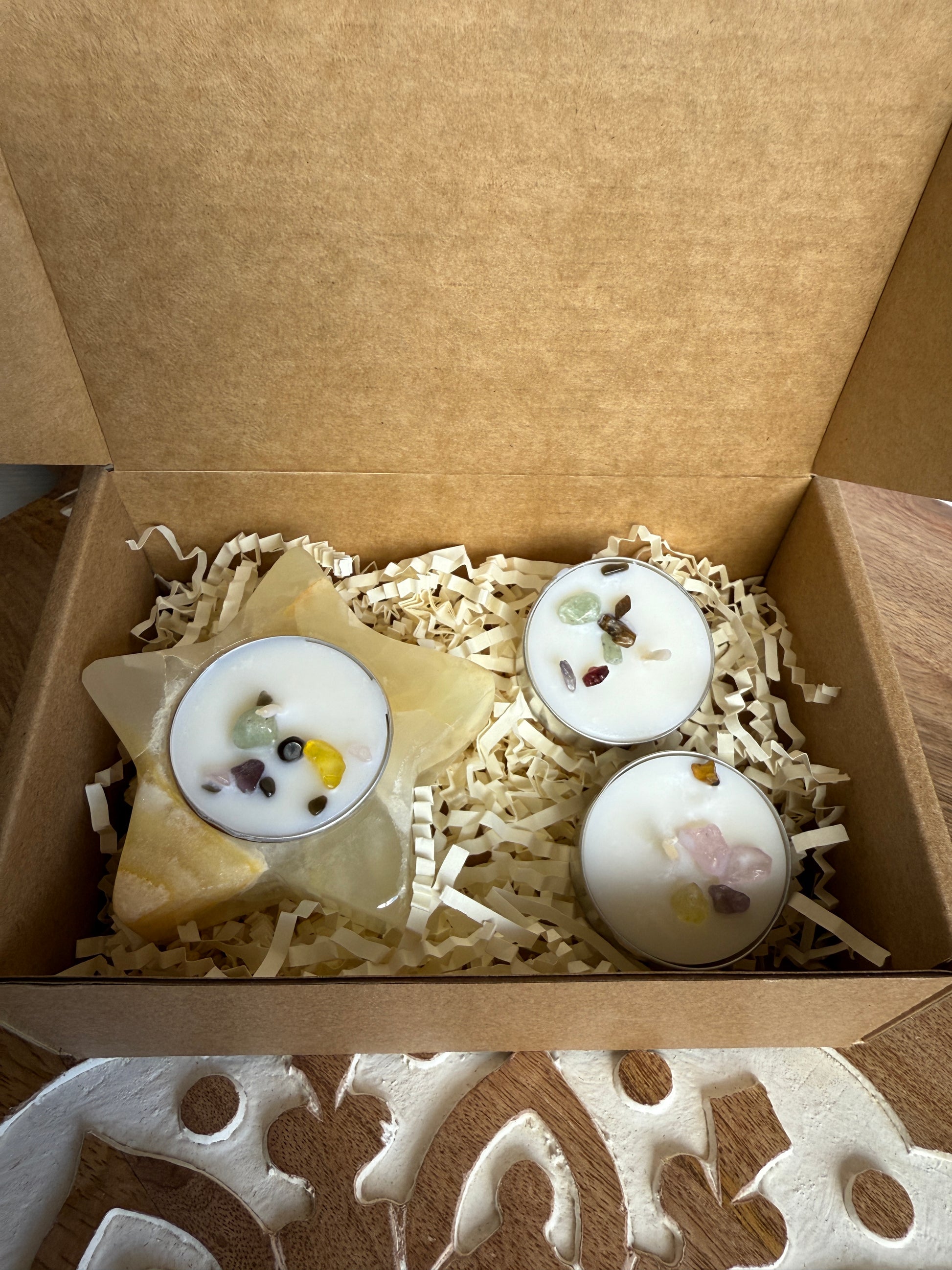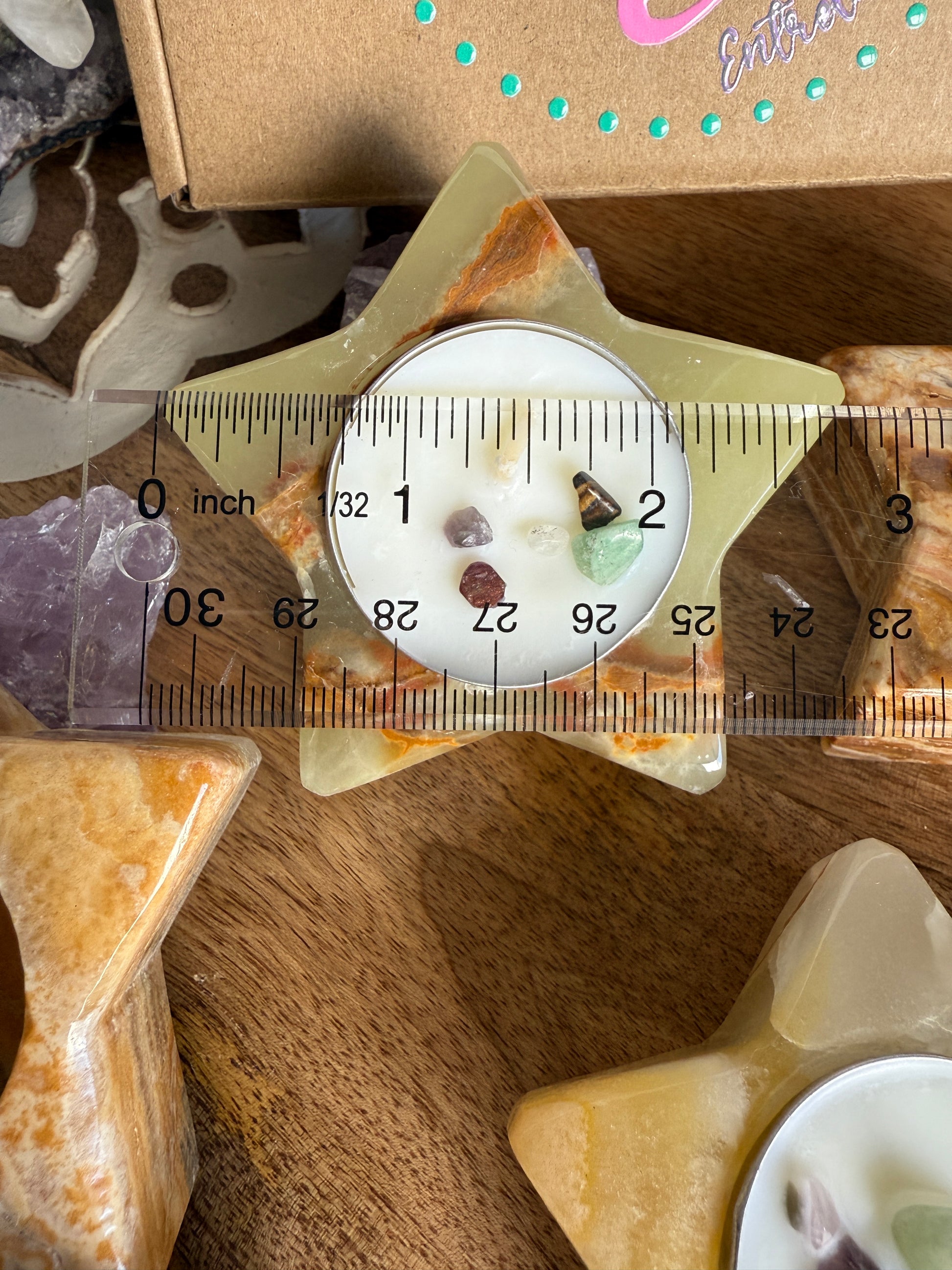 This beautiful ónix tea light holder meassures aprox 2.75”, and it comes with 3 handmade tea lights with natural stones, in a pretty box. A perfect gift !