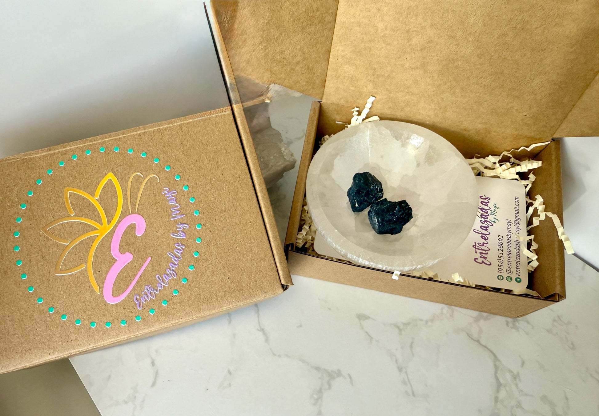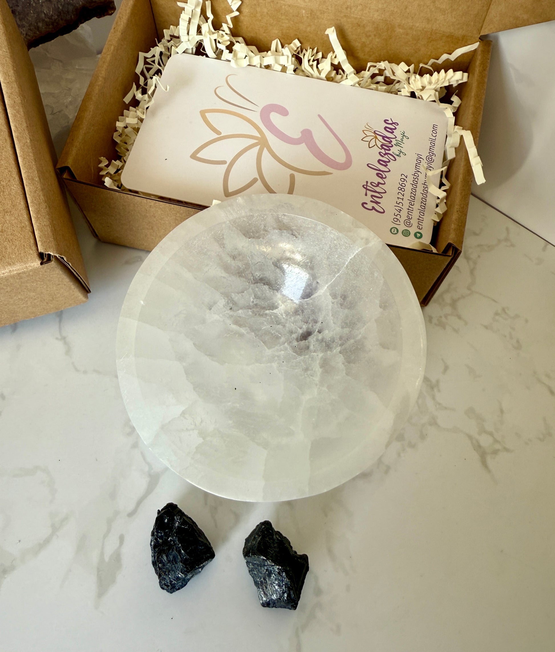 Keep the energy of your crystal jewelry and accessories clean and uplifted with this selenite bowl accompanied by tourmalines.